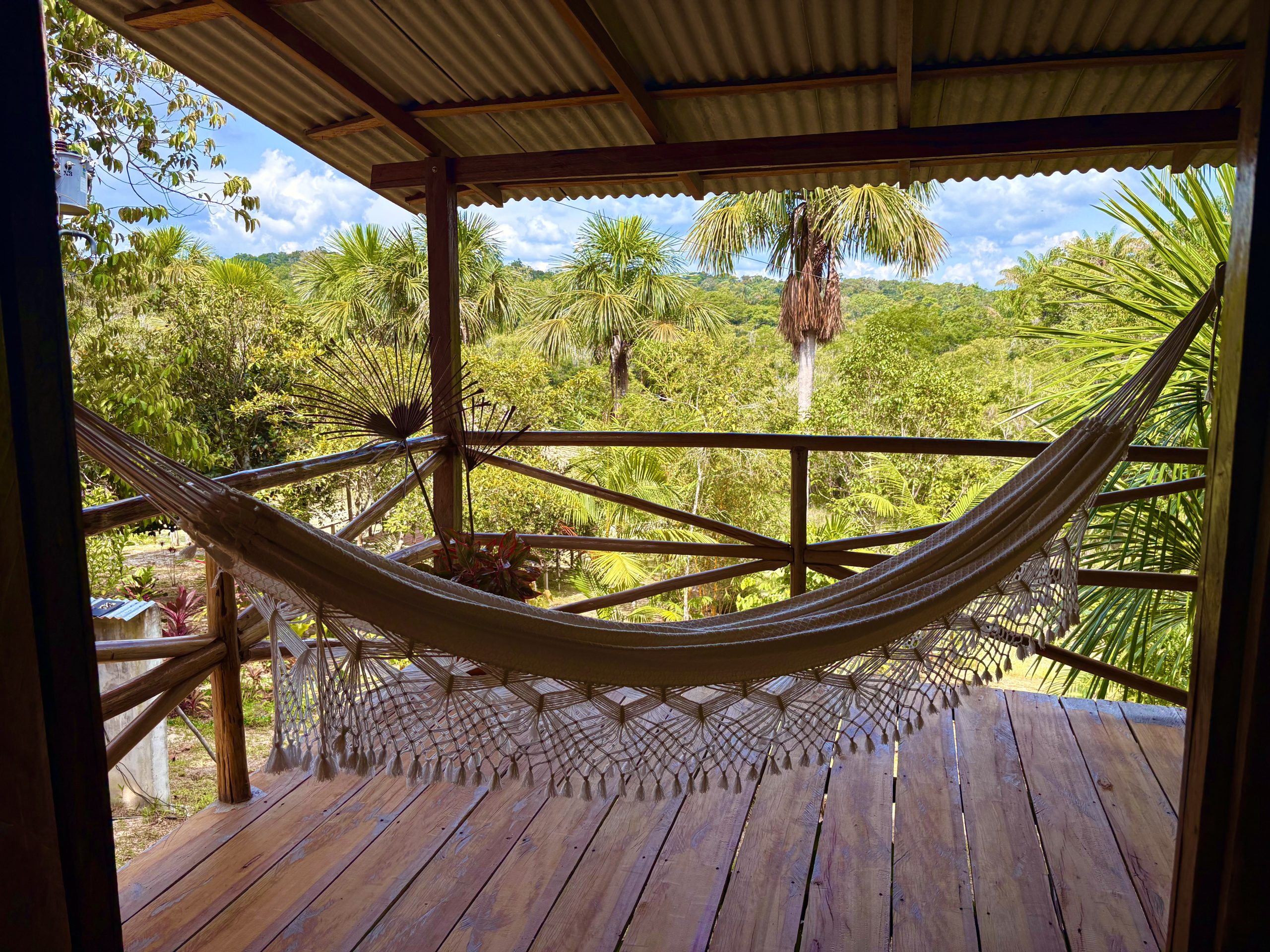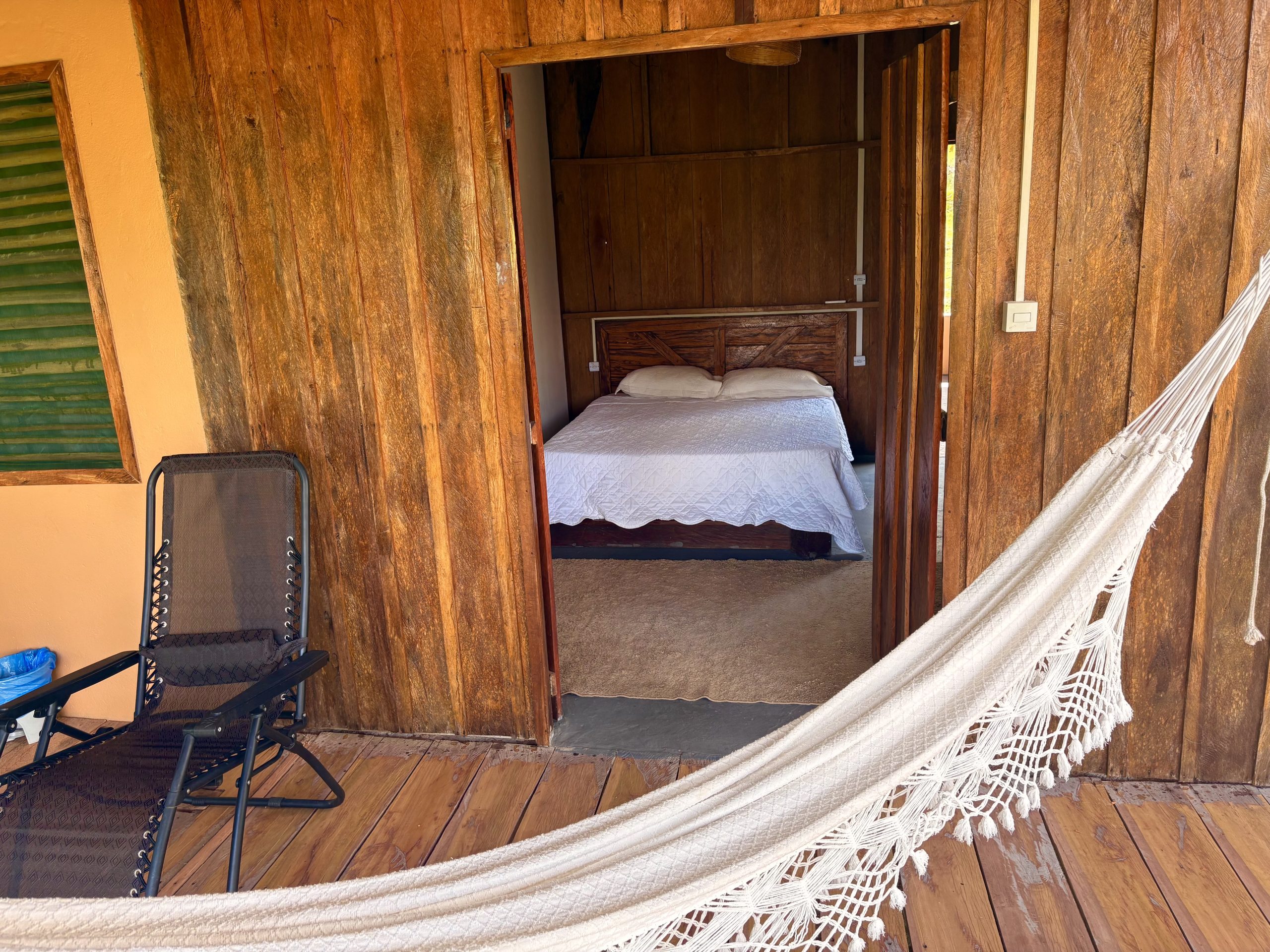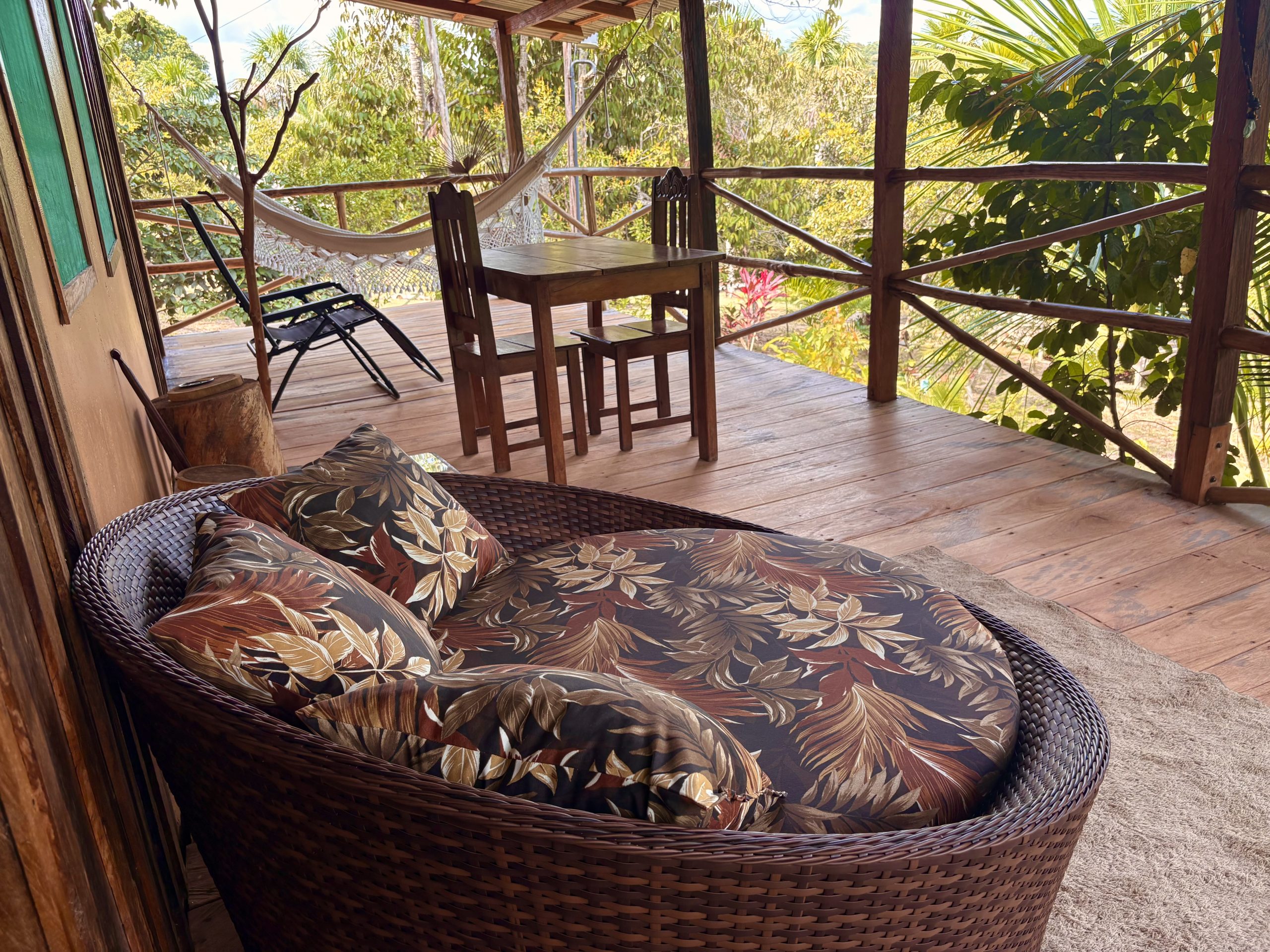 Nossas cabanas foram projetadas para proporcionar conforto e acolhimento aos nossos hóspedes. A decoração rústica, com móveis de madeira e cores neutras, cria um ambiente acolhedor e convidativo. Possui: ar condicionado, chuveiro elétrico, cama queen e cama de solteiro, mesa, cadeiras, roupeiro rústico, varanda com vista para floresta, redes para descanso, área externa, espreguiçadeiras, internet.