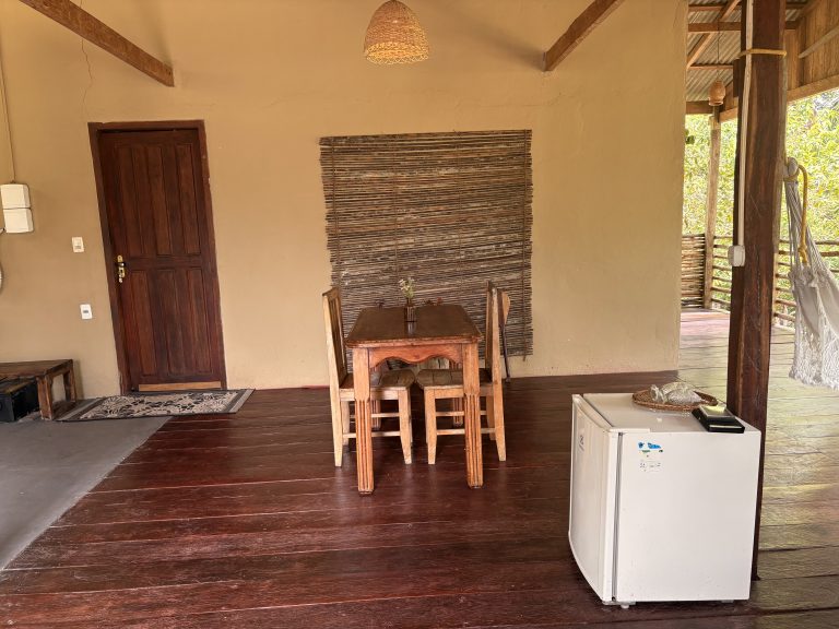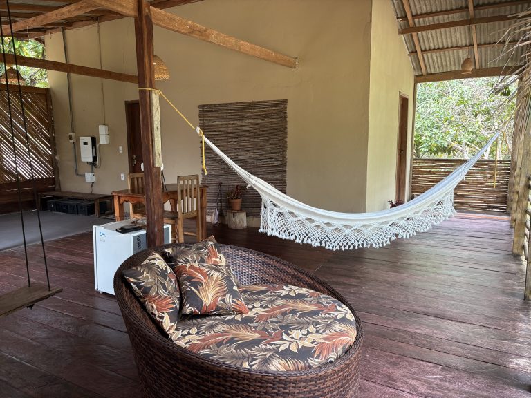 Nossas cabanas foram projetadas para proporcionar conforto e acolhimento aos nossos hóspedes. A decoração rústica, com móveis de madeira e cores neutras, cria um ambiente acolhedor e convidativo. Possui: ar condicionado, chuveiro elétrico, cama queen e cama de solteiro, mesa, cadeiras, roupeiro rústico, varanda com vista para floresta, redes para descanso, área externa, espreguiçadeiras, internet.